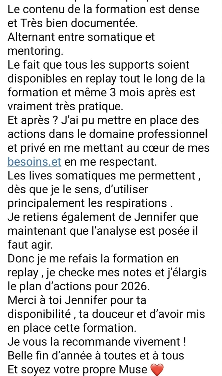 Ce que j'ai aussi constaté, après 10 ans à regarder d'autres thérapeutes, coaches, etc, c'est qu'ils restent dans le mental pour solutionner le problème : affirmations positives, journaling, mindset, méditations (il y en a dans Muse Incarnée) mais je n'ai trouvé aucun accompagnement qui associe le travail somatique (reconnexion au corps) et le travail neuro-identaire (système nerveux, inconscient). C'est là, que j'ai créé ma propre méthode par mes propres expériences, recherches, qui a fonctionné avec moi et mes clientes pour des résultats visibles, durables. C’est scientifique (neurosciences), profond (psychologie & symbolique) et incarné (pratiques somatiques).